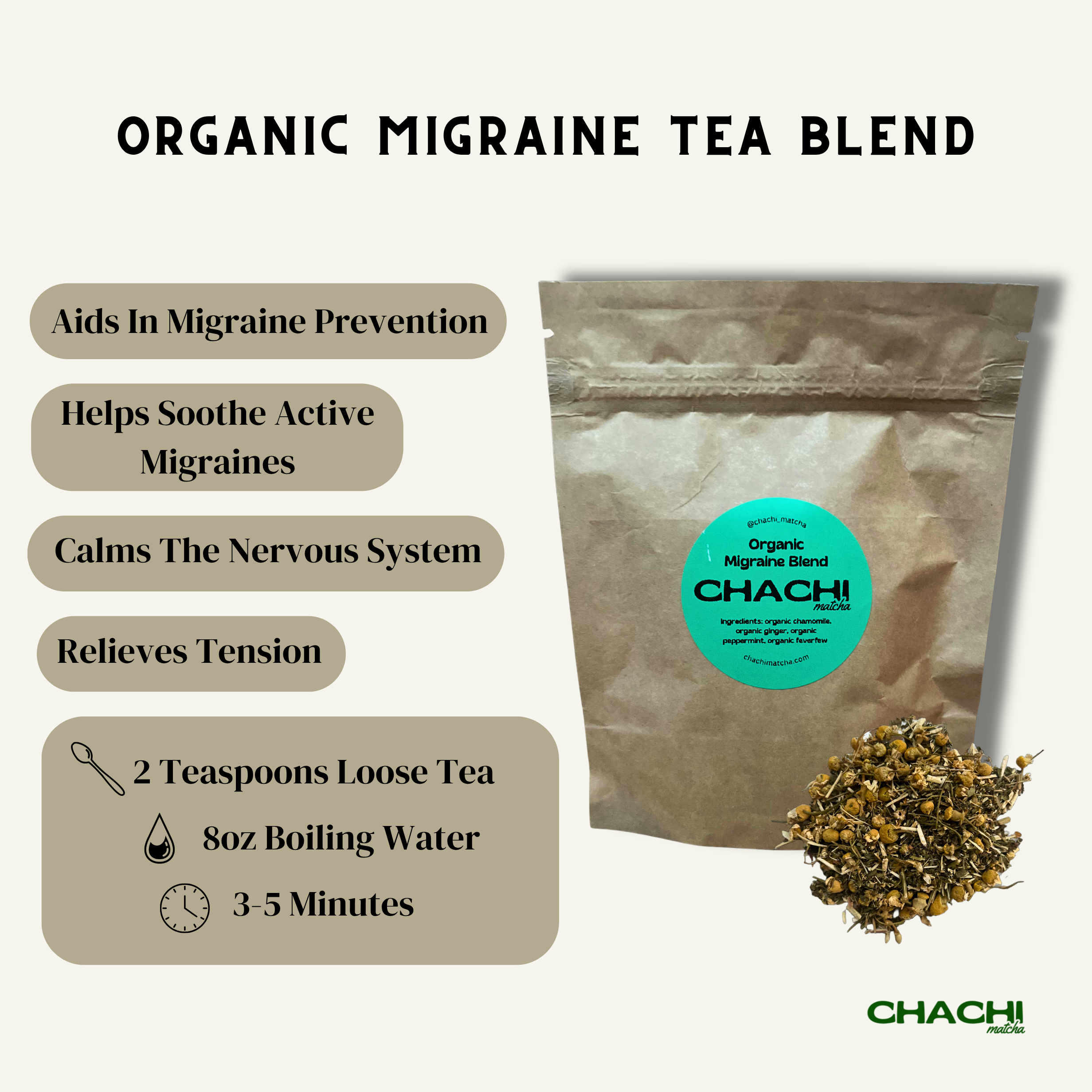 Organic Migraine Tea Blend - Loose Leaf Tea In Compostable Bag By Chachi Matcha - .7 oz $14.75 Add To Cart Added! Organic Premium Grade Matcha - 8 Grams Sample Pack $10.75 Add To Cart Added! Organic Premium Grade Matcha 30G - Compostable Packaging $22.00 Sold Out Sold Out Added! 30g Organic Premium Matcha $22.00 Sold Out Sold Out Added! Matcha Whisk (Chasen) $18.00 Add to cart Added! Matcha Whisk Kit $25.00 Add to Cart Added!